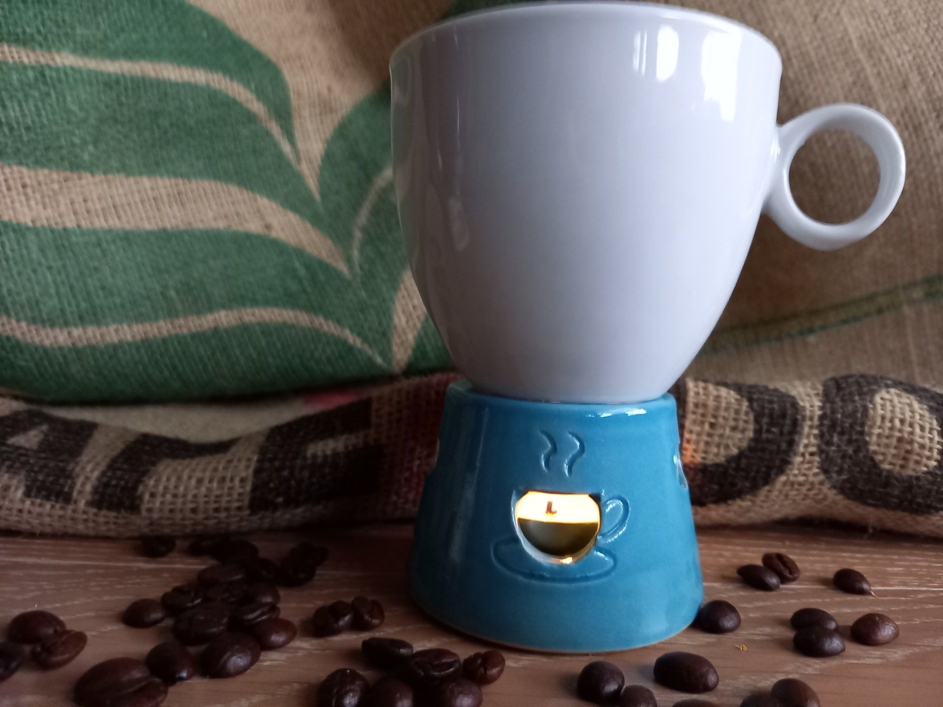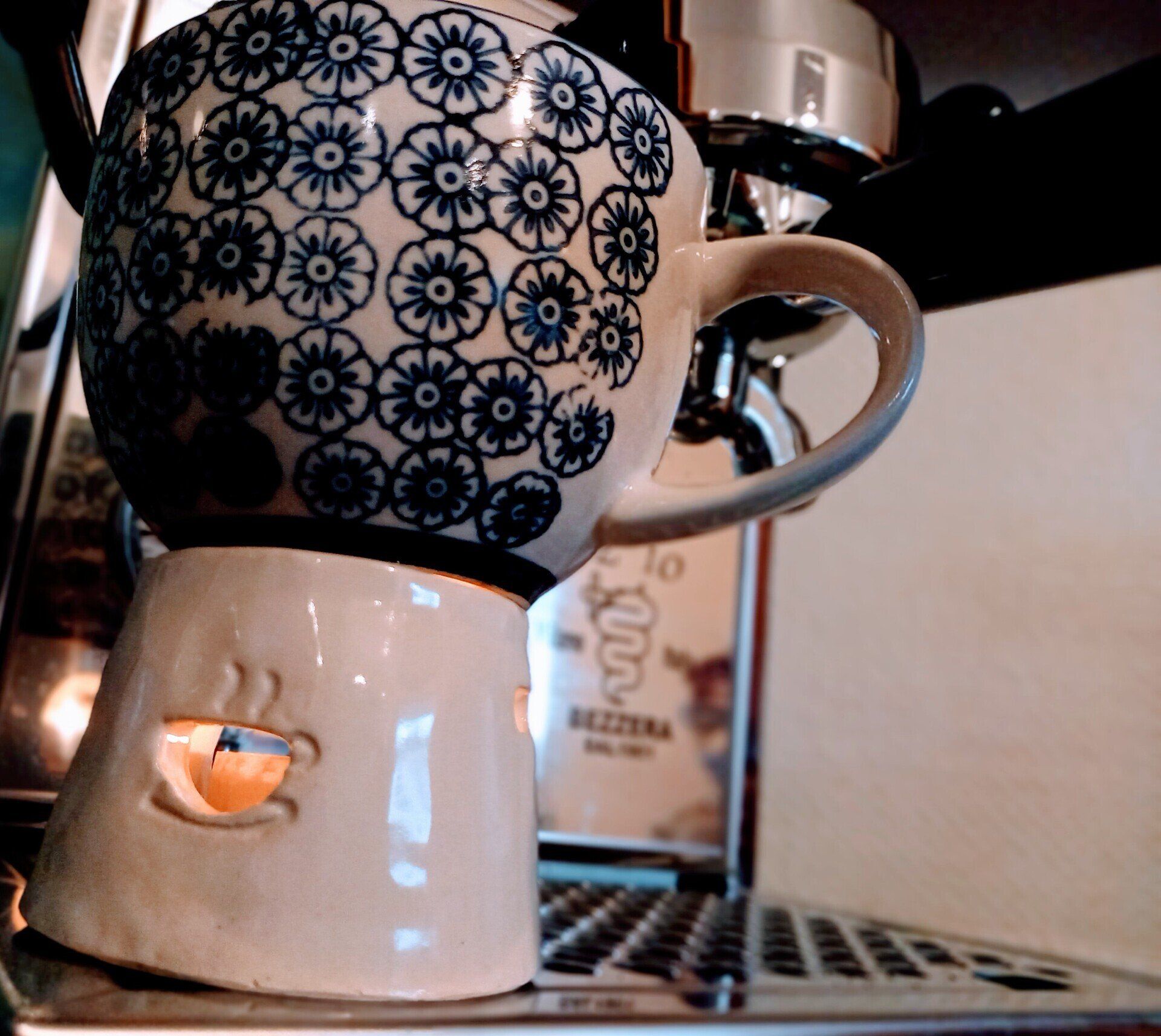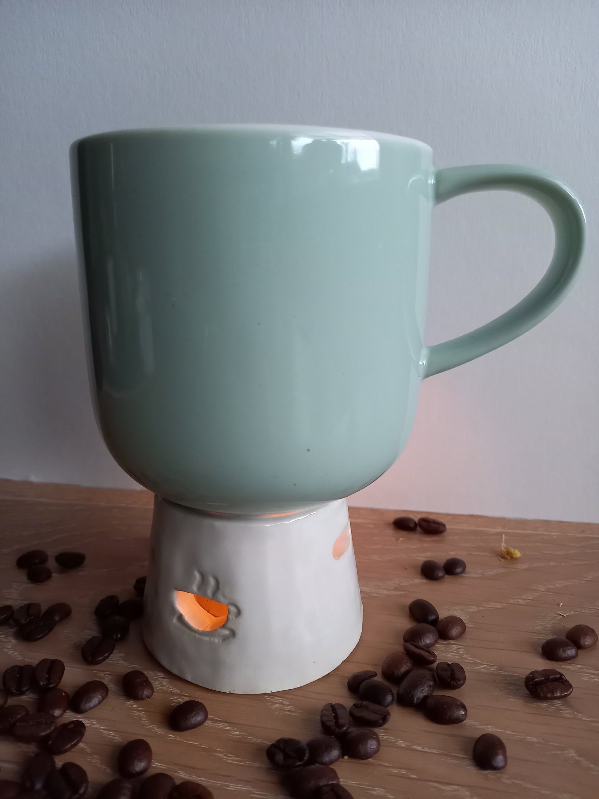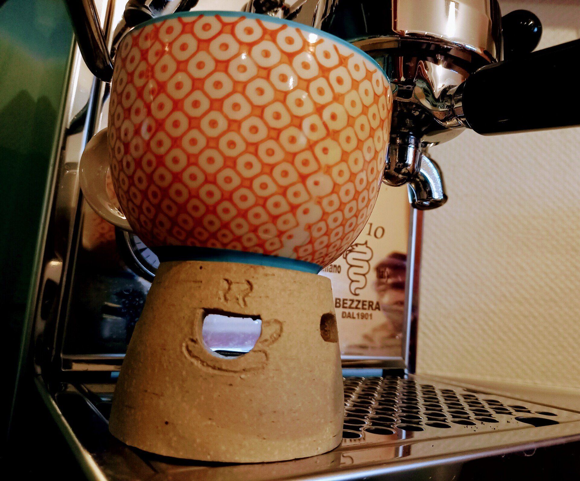Nach dem ersten Brennvorgang erfolgt die Lasierung, danach der abschließende Brand. Das zylinderförmige Stöfé mit einem Durchmesser von ca. 4,5 cm oben und ca. 7cm unten hat eine Höhe von ca. 5 cm. Bei der Nutzung bildet sich kein Ruß unter der Tasse.